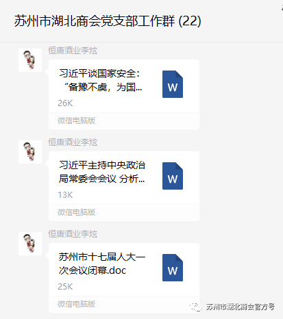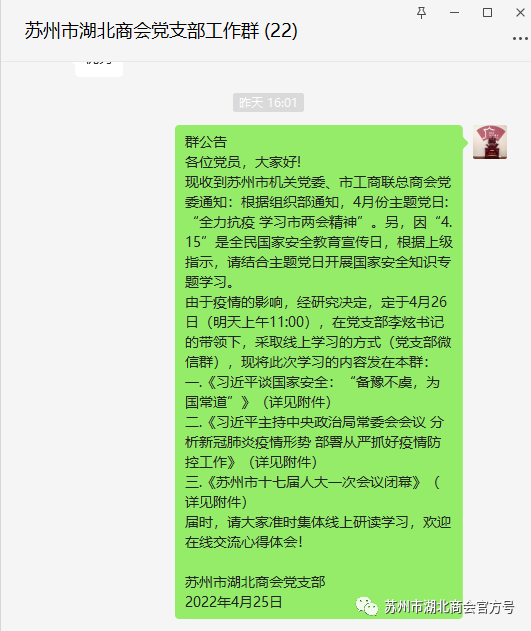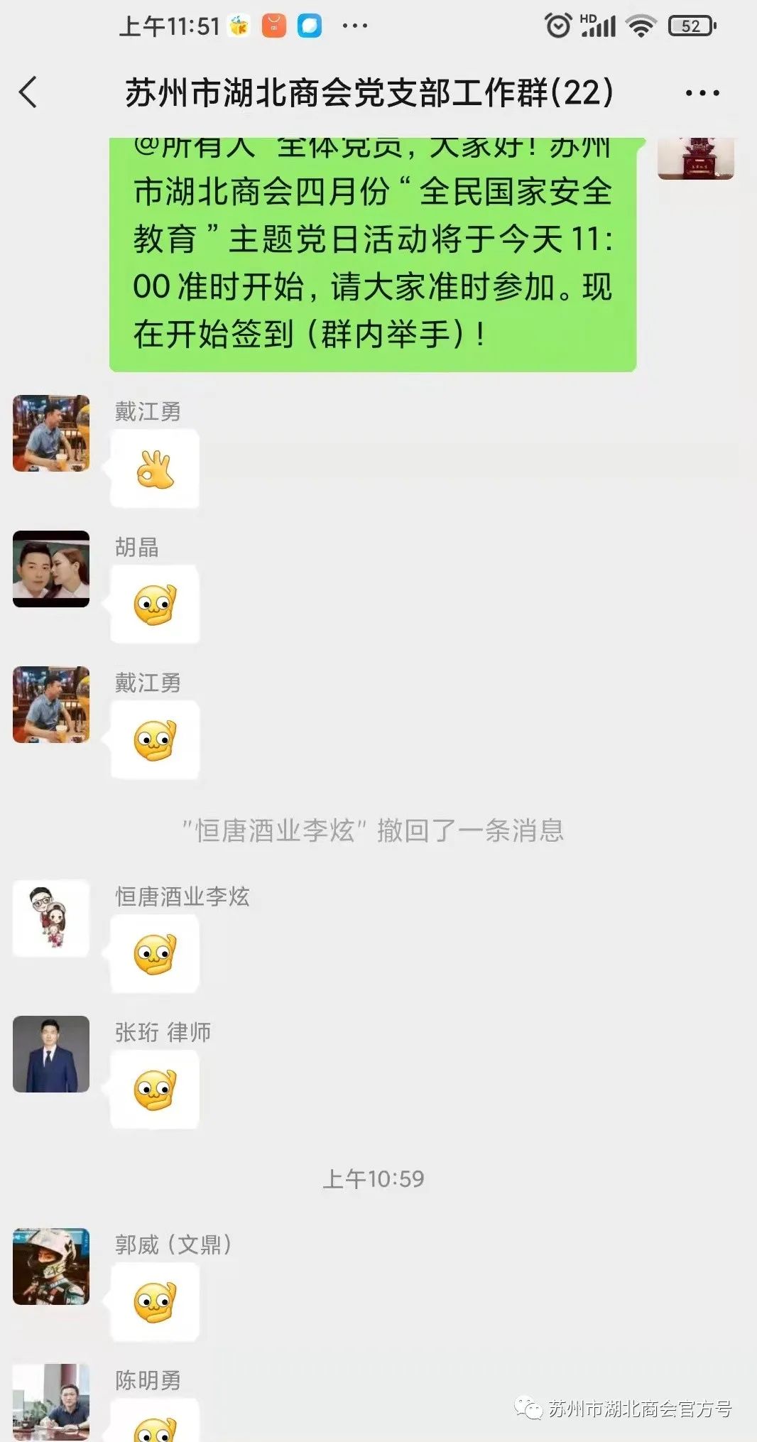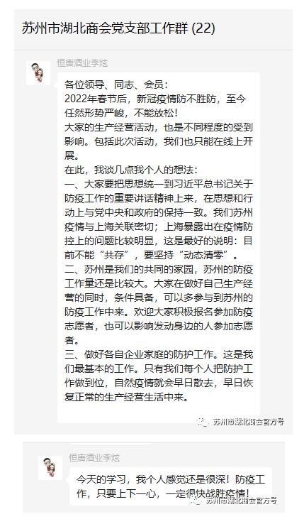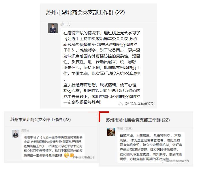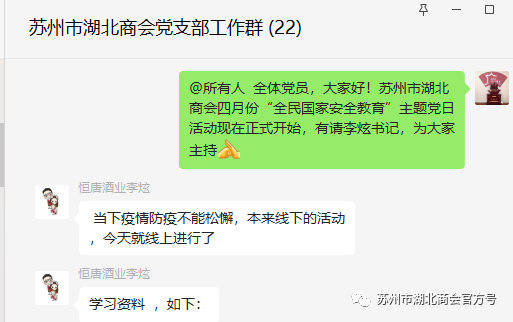 由于处在疫情期,大家通过苏州市湖北商会党支部群内“线上”的方式参加本次主题党日活动学习,活动由李炫书记主持。