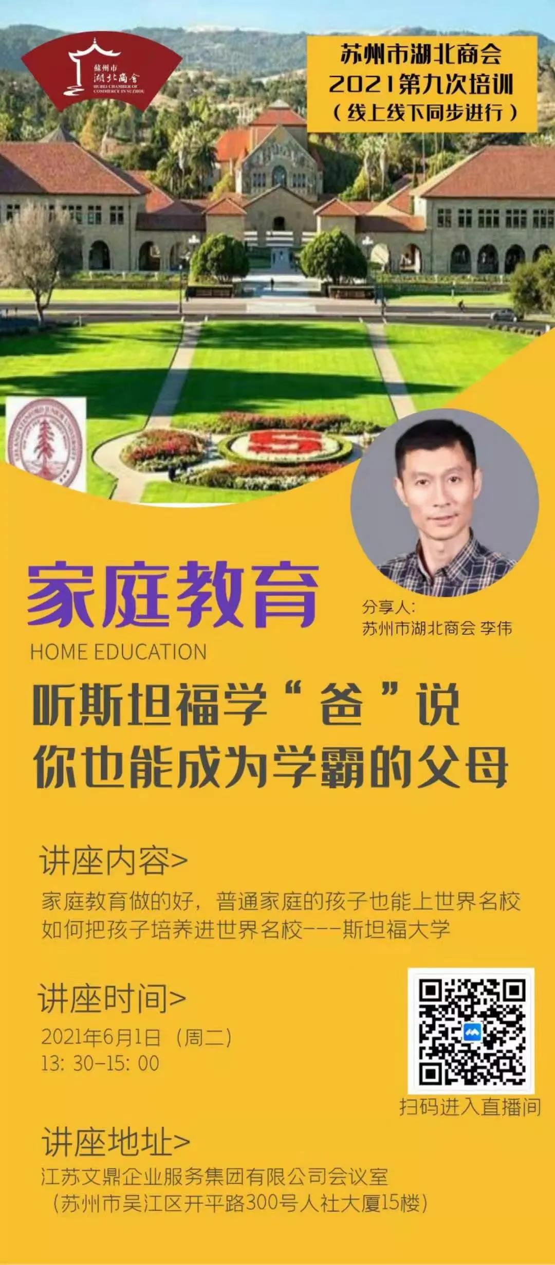 献礼“6.1”,2021年6月1日下午13:30—15:00,由苏州市湖北商会和江苏文鼎企业服务集团有限公司联办的“苏州市湖北商会2021年第九次(线上线下同步)分享培训”成功举办!苏州汉瑞德机电设备有限公司李伟总经理分享了他培养出一名斯坦福高材生的家庭教育经验。