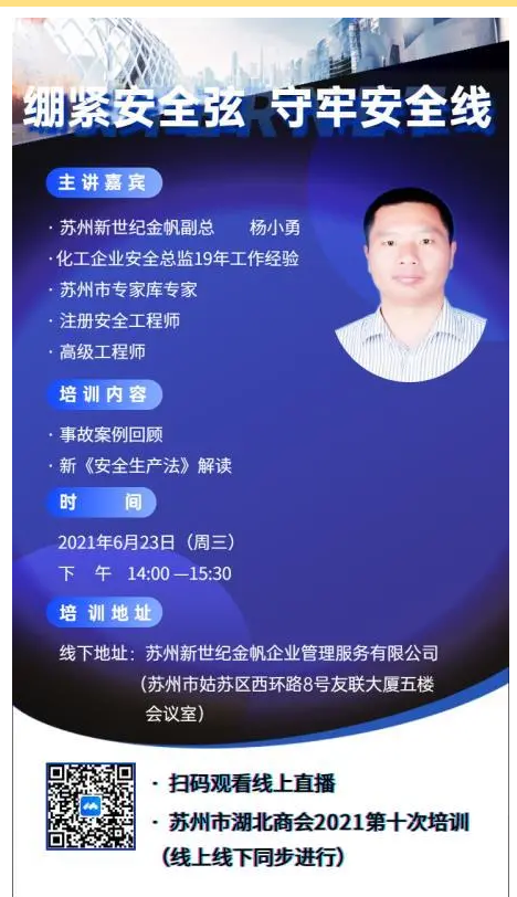 6月23日,成功举办苏州市湖北商会2021第10次(线上线下同步)分享培训之“绷紧安全弦 守牢安全线”企业安全生产管理讲座。商会会员及企业骨干近30余人参加了线下培训。