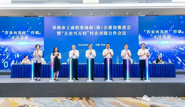 会上,“万企兴万村”行动正式启动。市委常委、统战部部长王飏,省工商联二级巡视员李晓东,市政协副主席、市工商联主席周俊,市民政局副局长严强,市农业农村局党组成员、副局长王纯,中国农业发展银行苏州市分行党委委员、副行长蒋敏,中国农业银行苏州分行党委委员、副行长吴国兵共同启动“万企兴万村”行动。